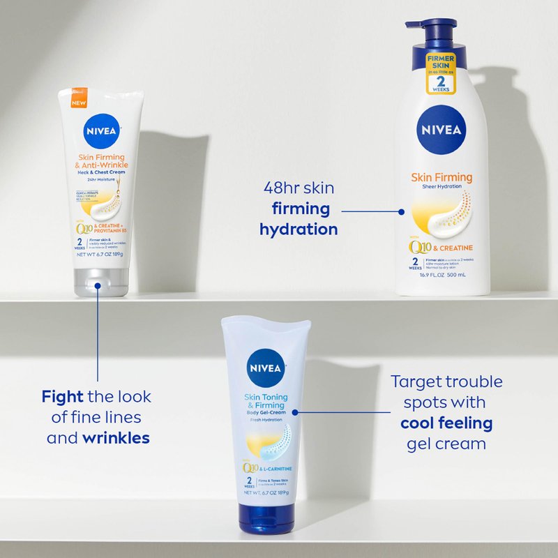 - Includes one (1) 16.9 fluid ounce pump bottle of NIVEA Skin Firming Hydration Body Lotion and one (1) 6.7 ounce tube of NIVEA Skin Firming & Toning Gel-Cream