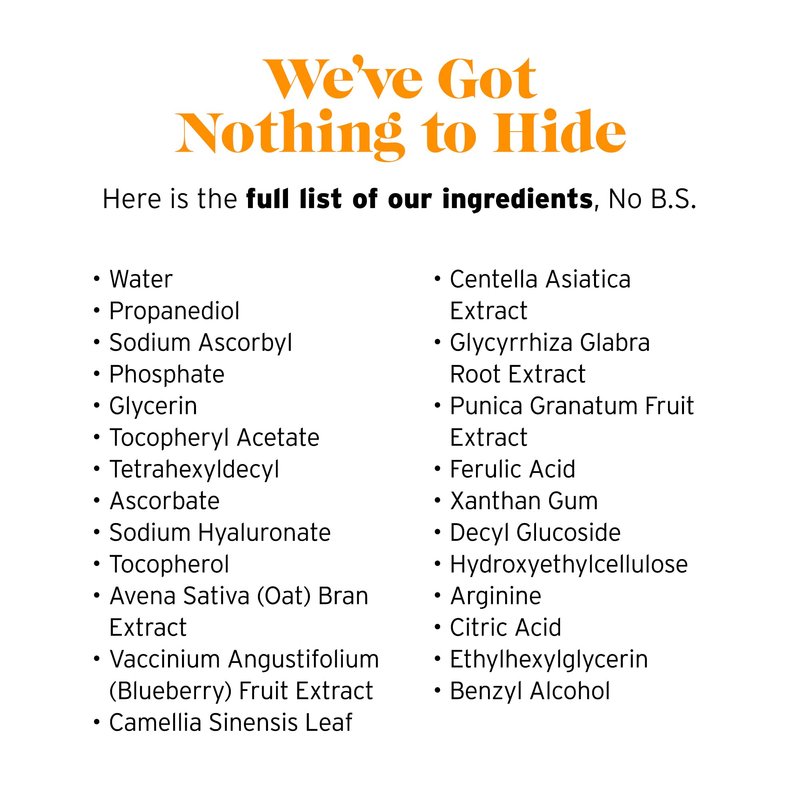 Introducing the No B.S. Vitamin C + E Serum, a powerful blend of Hyaluronic Acid, Gotu Kola, Ferulic Acid, and potent antioxidants designed to help protect, smooth, and brighten your skin. Perfect for women and men alike, this 1 FL Oz air travel size ready serum is crafted without parabens, sulfates, phthalates, petroingredients, or artificial fragrances. Our commitment to quality means we’ve excluded 1,600+ ingredients, aligning more with European standards that far exceed the American standard. Infused with 20% Vitamin C, this serum harnesses the power of antioxidants to support smoother, clearer, and more radiant skin. Regular use can help brighten your complexion, promoting a firm and youthful appearance. Enriched with Pomegranate and Green Tea, our serum can help maintain youthful skin and provides a seamless base under makeup for your daily beauty routine. Vitamin E can help moisturize and tighten, Hyaluronic Acid can help hydrate, Pomegranate can help rejuvenate, Vitamin C can help restore, and Gotu Kola can help clear impurities, helping your skin face daily environmental factors with confidence. Vegan and proudly made in America. No B.S. stands by ethical practices, ensuring that our products are cruelty free.