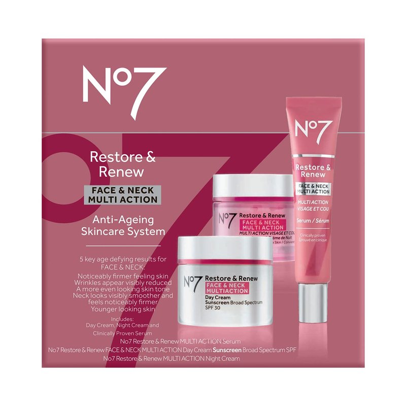 - Complete Your Regimen - This face care kit contains face products from No7's Restore & Renew collection. These skin products target face and neck and visible signs of aging skin. All the formulas in facial skin care products are supercharged with the age-defying technology from No7's clinically proven Multi Action Face Serum.