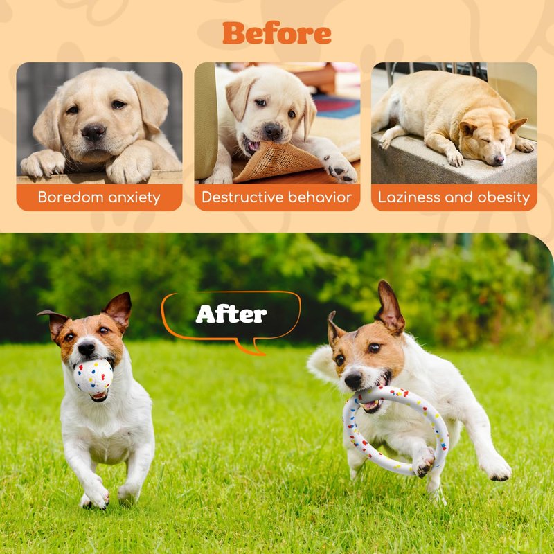 - HIGHLY ELASTIC & DRAINS PUPPY ENERGY - Highly elastic training dog balls can help your dog release excess energy and reduce boredom, anxiety, and destructive behavior. Highly bouncy dog balls encourage dogs to jump to new heights. Random landings and bounces allow dogs to follow, jump, and pick up, which is great for training puppies. It can also increase your emotional interaction with your dog.
