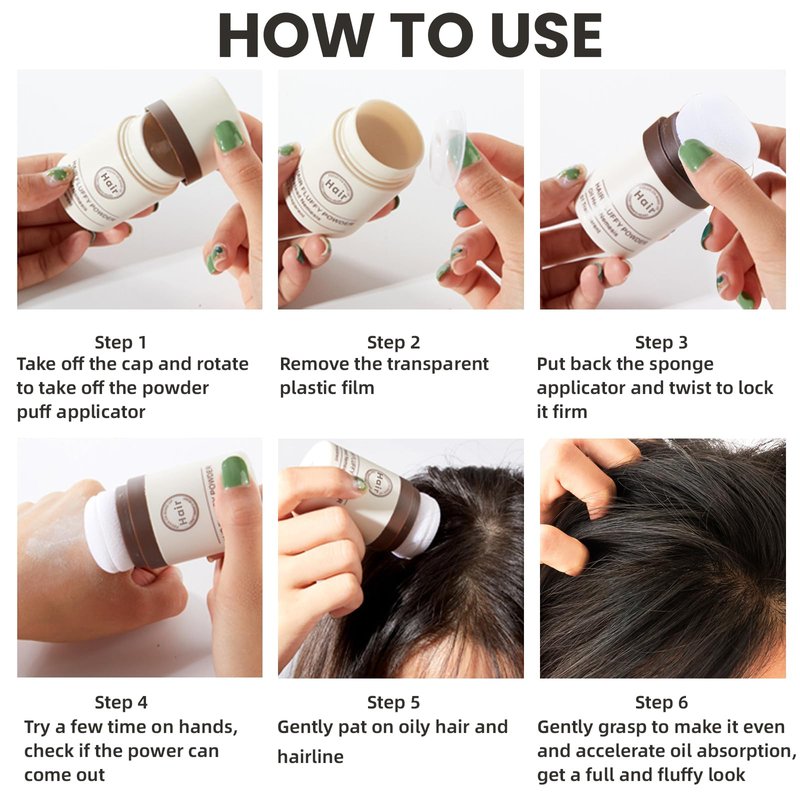 - 【How to Use】1. Take off the powder puff applicator; 2. Remove the plastic film in the bottle, so the powder can release through the powder puff applicator smoothly. You don’t need to put back the plastic film so no need to take it off for the further use; 3. Gently pat the powder on the hair. For the two colored powder, you can also apply it on hair line, hair root to create hairline shadow; 4. Gently rub the hair to make it even and accelerate oil absorption, get a full and fluffy look.