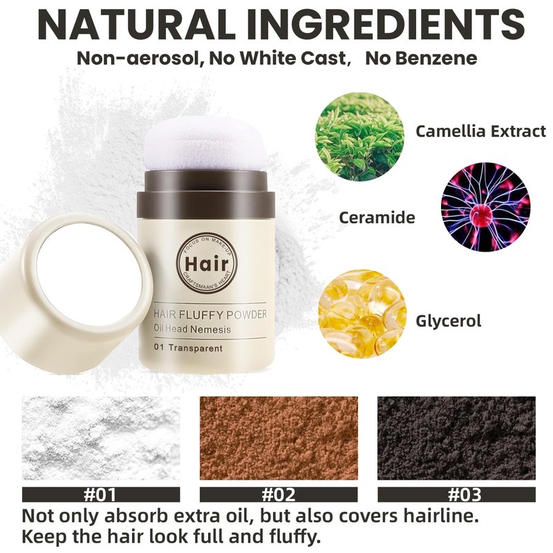- 【3 Colors for Choice】We provide 3 colors for you to choose: #01 Transparent, #02 Light Brown and #03 Dark Brown. The #01 transparent one is suitable for all hair color, after apply it melt with the original hair color, won’t leave any residual or white cast. The #02 light brown is suitable for light hair and #03 is suitable for dark or black hair, these two can not only absorb the hair oil, but also cover up hairline, giving the hair a fuller look.