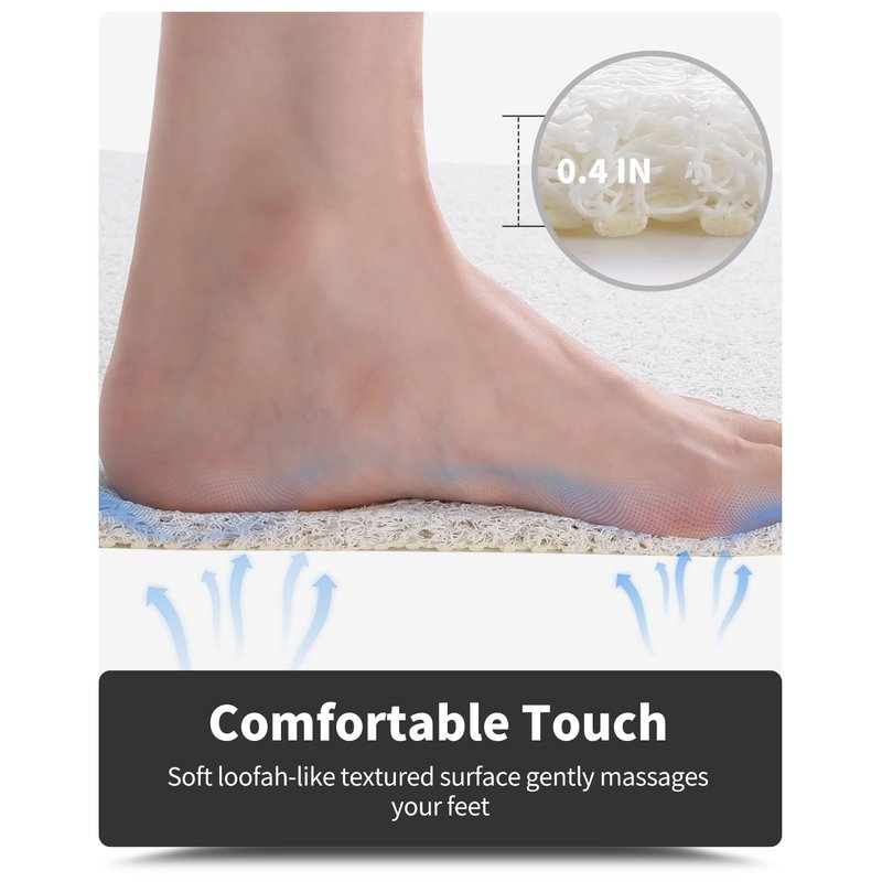 - Comfort Shower: Soft loofah-like textured surface of ideal thickness makes this shower rug comfortable for your shower in bare feet. Besides cutting the cold hard floor off from your body and providing a warm support, it also gently massages and exfoliates your skin.