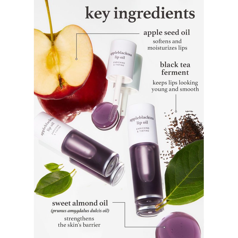 - ABOUT APPLEBLACKTEA LIP OIL: Our tinted lip glow oil is formulated with apple seed oil and black tea extract to instantly moisturize and keep lips smooth. This unique formula helps lips appear glossy, clear, and more kissable and youthful.