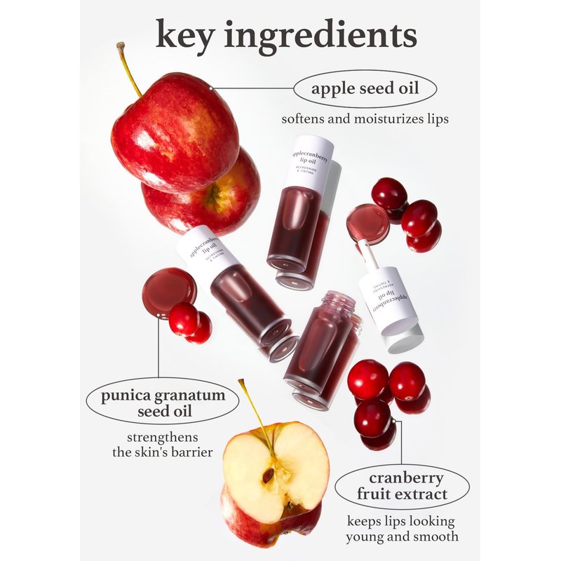 - ABOUT APPLECRANBERRY LIP OIL: Our tinted lip glow oil is formulated with apple seed oil and cranberry fruit extract to instantly moisturize and keep lips smooth. This unique formula helps lips appear glossy, clear, and more kissable and youthful.