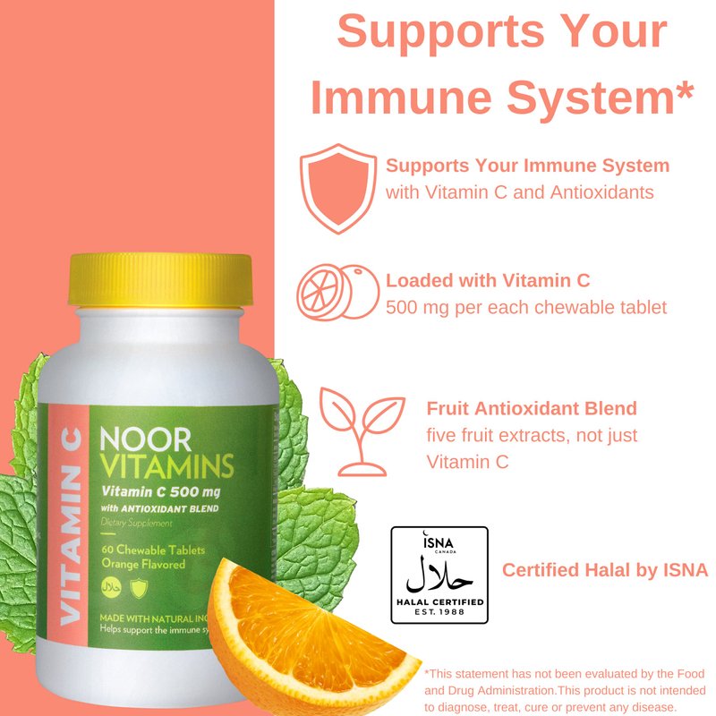 Noor Vitamins Vitamin C chewable vitamins is a bioavailable vitamin c specially formulated for today’s immunity needs formulated by our pharmaceutically-trained doctors. Our vitamin c high potency is a complete, high-quality vitamin c pills that are chewables, taken once a day that supports natural immune defense for health-conscious men and women.* Ranked as one of the best halal vitamins Noor Vitamins immune system vitamins provides all the benefits of a daily vitam c for men and women with 26 vitamins and minerals immunity vitamins with extra antioxidents. An natural blend of herbs and antioxidents adds natural antioxidants for maximum performance. Noor Vitamins is the leading halal vitamin brand worldwide known for scientific formulations and powerful ingredients and decade of making halal vitamins for women , halal vitamins for men and halal vitamins for kids, they have started to make their product mainstream for the vegan, vegetarian and Kosher consumer and anyone else looking for high quality supplements. Noor Vitamins never contain gluten, allergens or GMO and are always halal certified. Many Noor Vitamins products are also vegan, vegetarian and Kosher friendly. *These Statements Have Not Been Approved By The U.S. Food And Drug Administration. These Products Are Not Intended To Diagnose, Treat, Cure, Or Prevent Any Disease.