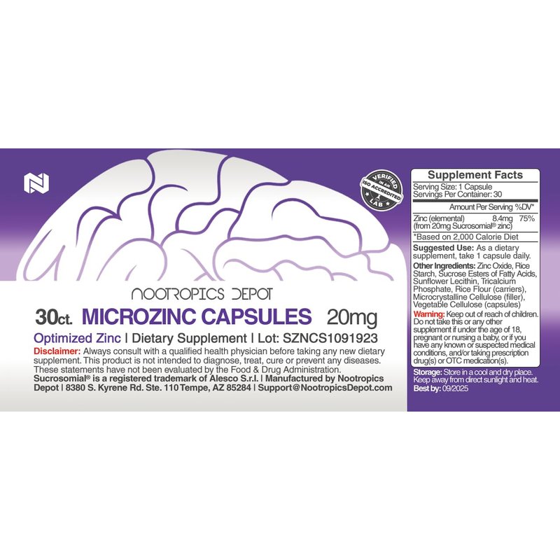 Nootropics Depot MicroZinc Capsules | 20mg | Optimized Zinc Supplement | 30 Count