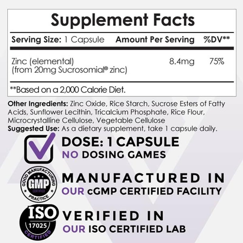 - 20mg Capsule Contains 8.4mg of Elemental Zinc Per Serving