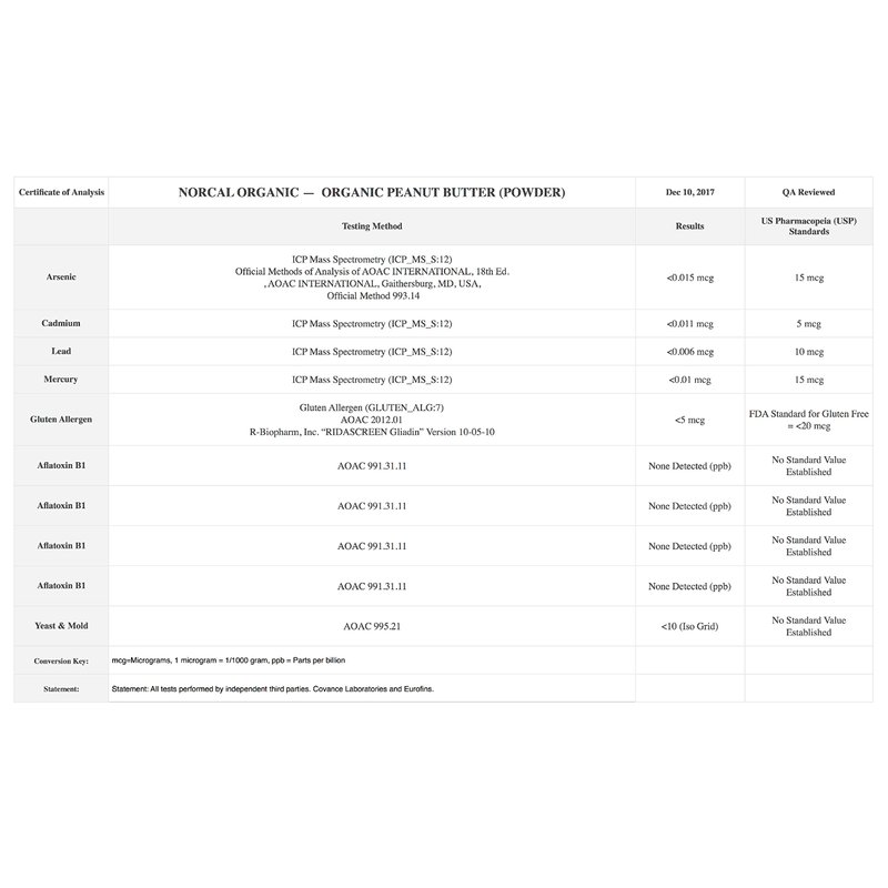 NorCal Organic Peanut Butter Protein starts with organic Spanish variety peanuts grown on Southwest Texas family farms. The dry conditions of Southwest Texas create the ideal growing environment for organic peanuts. The peanuts are harvested, lightly roasted, and 100% mechanically processed without the use of solvents to create a vegetarian/vegan friendly powder with 11 grams of protein and 4 grams of fiber per serving. Like all of NorCal Organic's products, our peanut butter protein is tested by independent labs for impurities, including heavy metals and aflatoxin. NorCal Organic is committed to working with farmers who practice and support organic and sustainable farming and animal welfare.