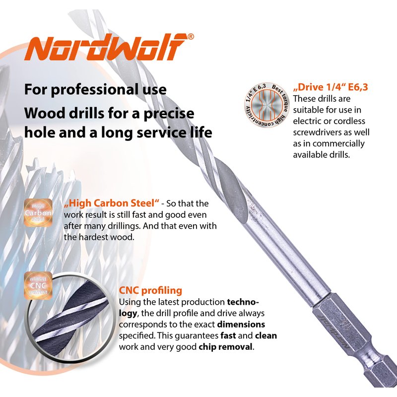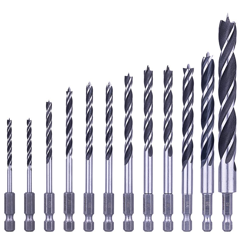 NordWolf 12-Piece Brad Point Wood Drill Bit Set for Carpenter Woodworking, Double Flutes Design with 1/4" Hex Shank, SAE Sizes 1/8" to 1/2"