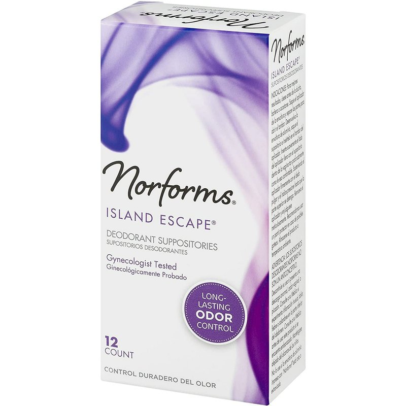 Norforms Feminine Deodorant Suppositories Island Escape 12-Count by Norforms provides effective, refreshing protection that lasts for hours. They're individually wrapped in sanitary foil and are gentle for everyday use. Each box contains 12 Norform suppositories that help combat odor internally and safely with an applicator for easy insertion. They're pH balanced and hypoallergenic and have a tropical plumeria fragrance. This product is dermatologist and gynecologist tested. Norforms are your secret weapon for odor control. This effective long-lasting odor control comes in 2 scents. Island Escape is a luxurious plumeria fragrance with a tropical flair, while Tropical Splash is as fresh as a light tropical rain shower.