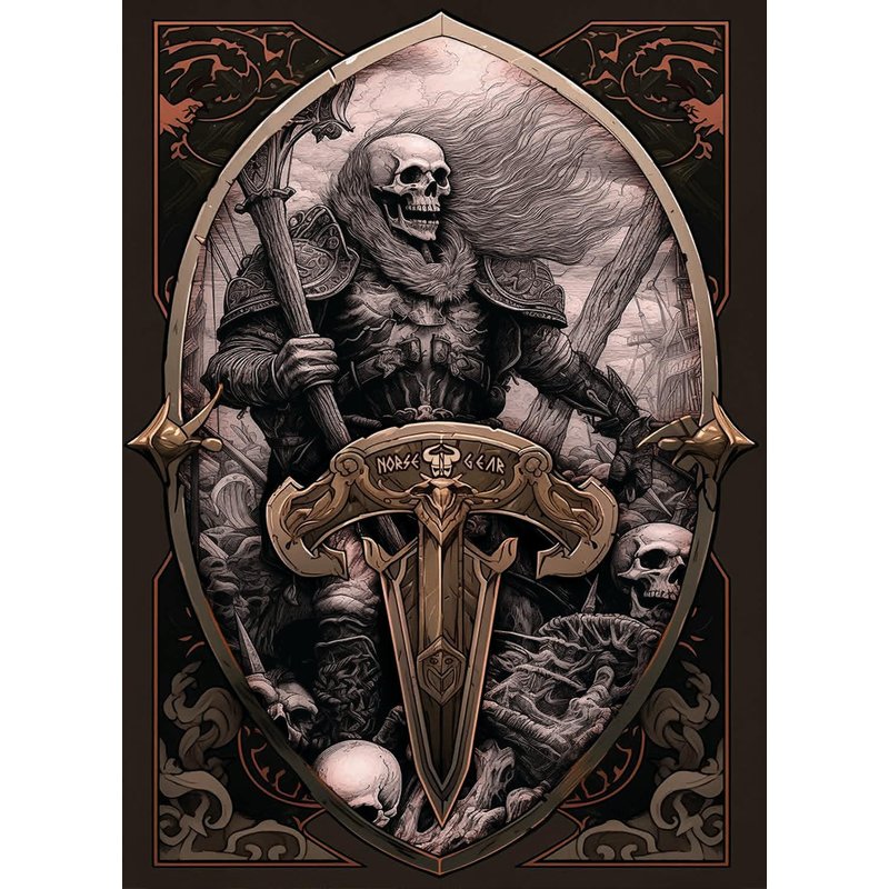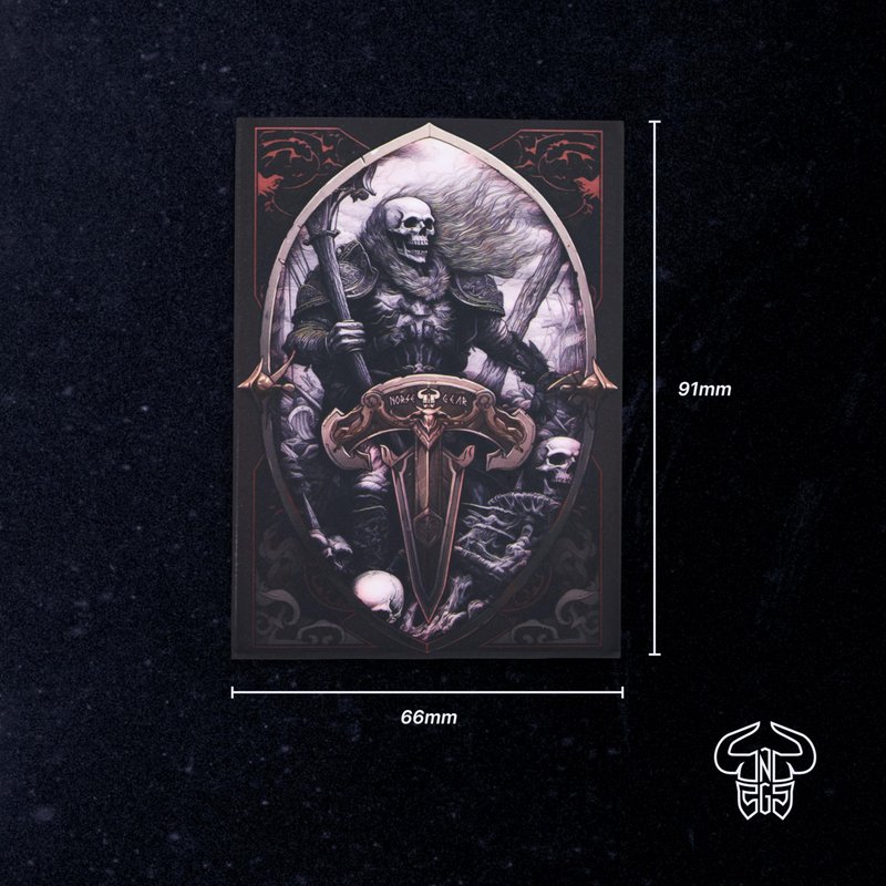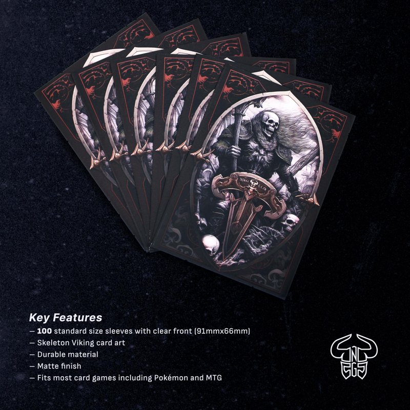Elevate your card gaming experience with Norse Gear Matte Card Art Playing Card Sleeves. These standard size sleeves (91mmx66mm) feature striking Skeleton Viking artwork, adding a unique touch to your card collection. The matte finish and clear front ensure your cards remain visible while protected. Designed to fit most popular card games like Pokémon and Magic: The Gathering (MTG), these sleeves offer durable protection and make shuffling easier. Add an eye-catching style to your collection and protect your cards at the same time with these high quality sleeves. Protect your cards in style with Norse Gear's high-quality sleeves.