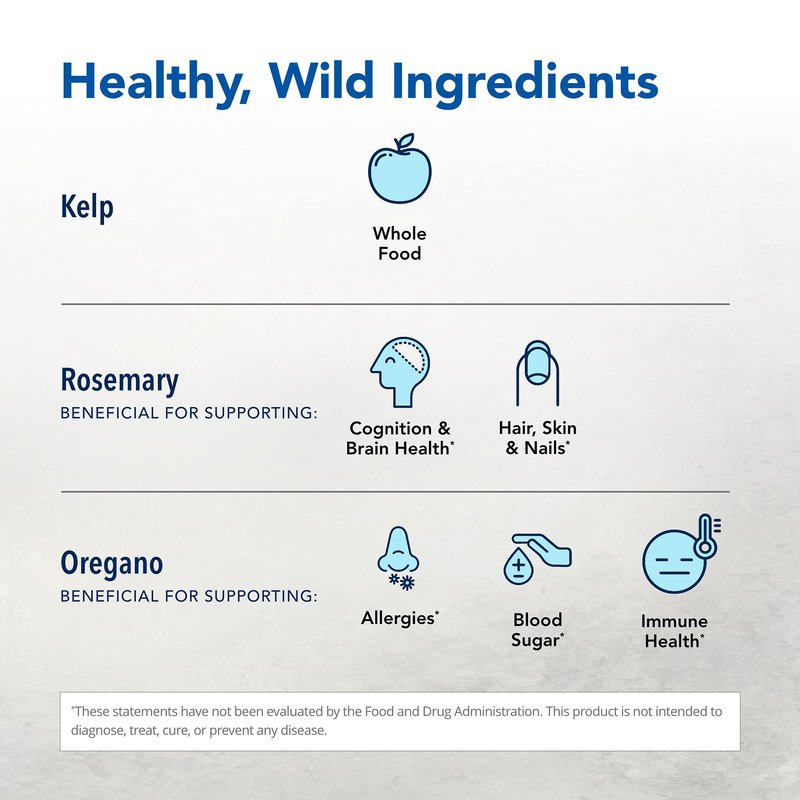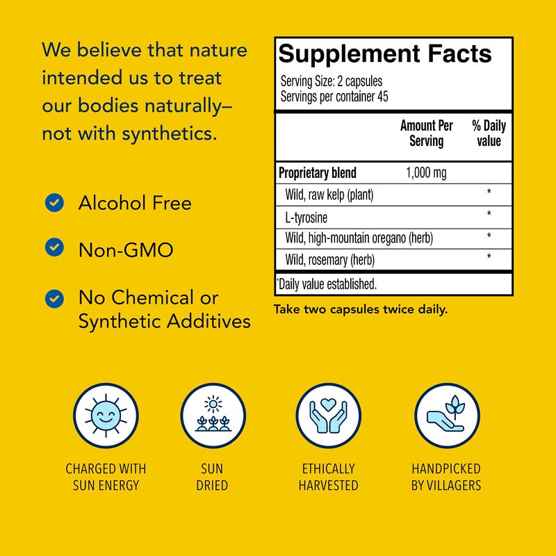 - Full Ingredient List; Wild, raw kelp (plant), L-tyrosine, wild high-mountain oregano (herb), wild rosemary (herb); Free of all chemicals, pesticides & additives; Non-GMO