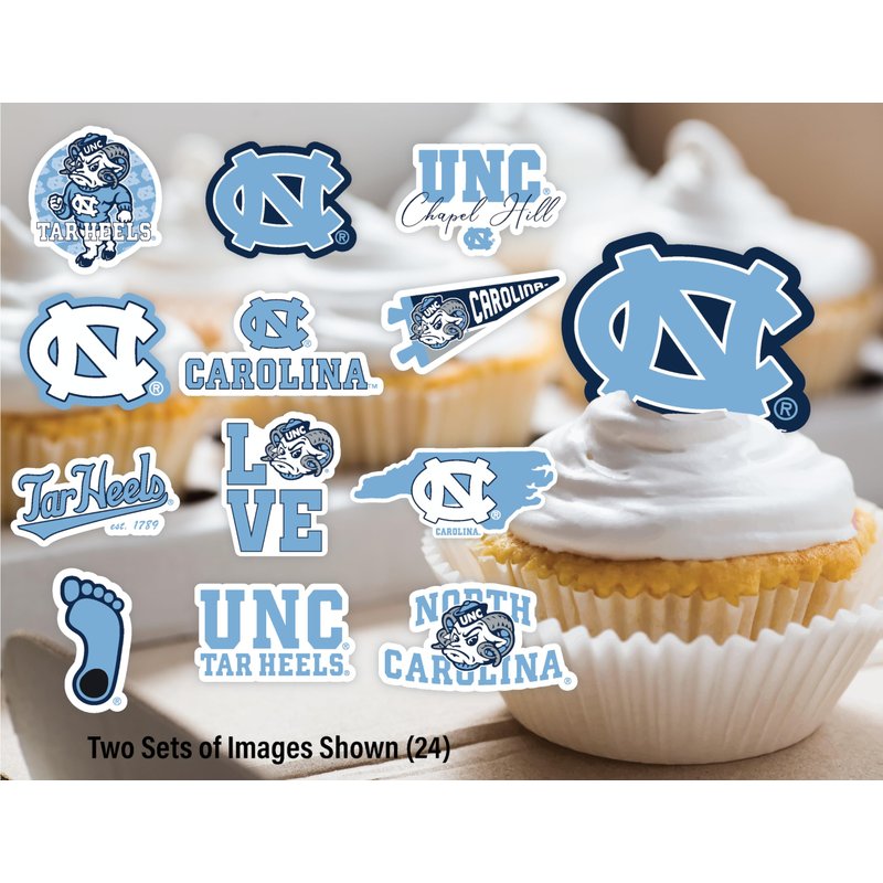 North Carolina Tar Heels cupcake toppers (24 Pieces) designed for an effortlessly memorable party. Celebrate in true Tarheels spirit with premium University of North Carolina party decorations. Perfect kickoff to your next birthday party, graduation decorations, going away party, retirement party, or tailgating with officially licensed North Carolina merchandise. Pairs nicely with your own color coordinated balloons and plates to gift with UNC apparel, shirts, flags, and other blue or North Carolina merch. With these easy-insert cupcake toppers, it's never been easier to throw a memorable party. Let's go Tar Heels!