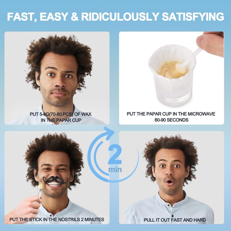 - 👃【Easy & Quick Nose Hair Remover Wax】Hard Nostril Waxing Kit. Our nose hair wax kit will remove hair from your nostrils in seconds, giving you a quick and efficient way to eliminate unwanted hair. All done in a simple painless procedure. Simply dip the applicator in warm wax, dip into the nostril, and pull out within two minutes. Applicable for men & women, nose hair removal kit for men and women is the best pain-free natural hair extraction kit. Excellent ear waxing kit men. Nasal wax nose cup