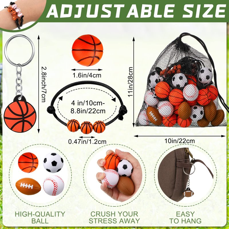 - Adequate Quantities and Styles: you will get 36 sport theme charm bracelets, 36 mini sports stress balls and 36 sports ball keychains, each designed in 4 kinds of balls, soccer ball, basketball, football and baseball, 9 pieces of each ball, with 1 storage bag, enough quantities and styles to show the sports party atmosphere
