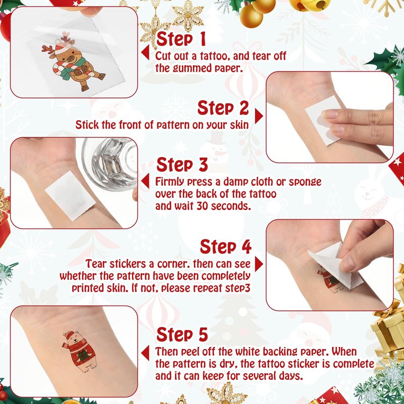 - Reliable and Safe to Use: these glitter Christmas tattoo stickers are made of quality materials, and the surface is added with glitters, beautiful and special, not easy to break or fade; Warm reminder: you need to cut out the pattern of tattoo first, tear off the surface film, then wet it with clean water, wait it for about 35-50 seconds, and finally tear it off gently