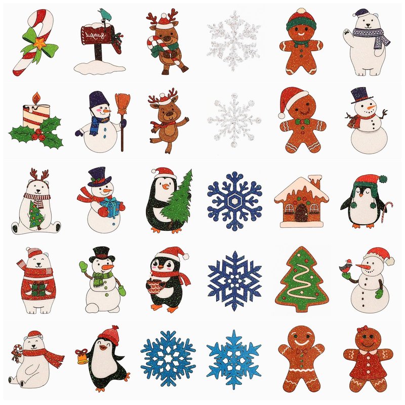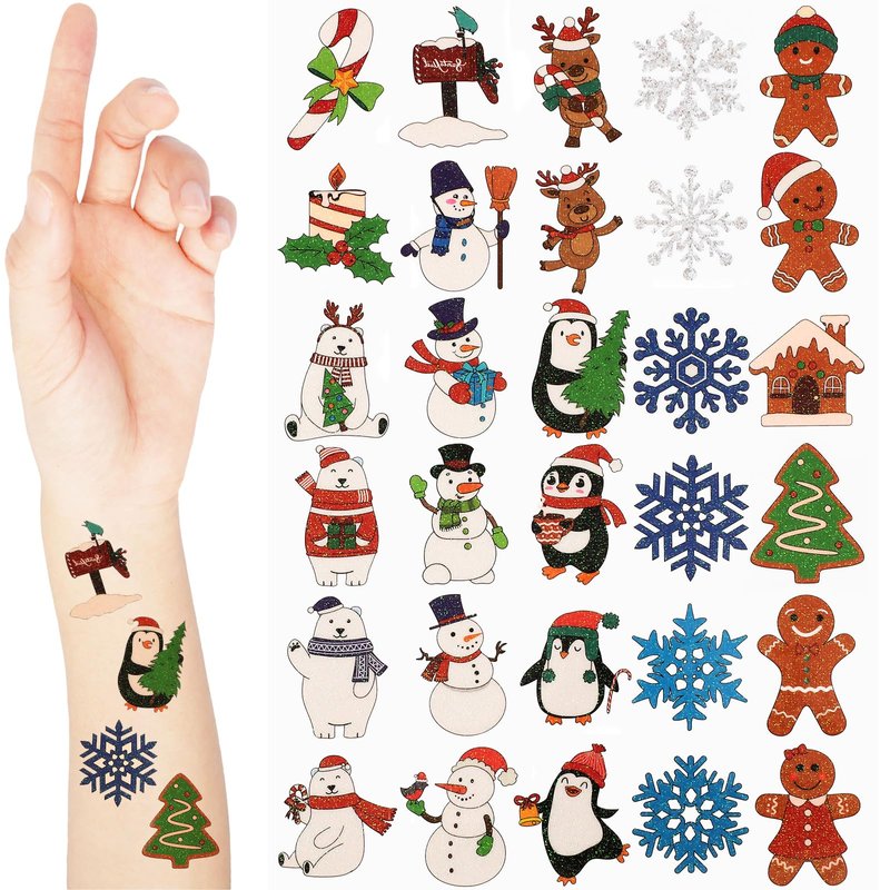 - Appropriate Size: each sheet of the Christmas winter glitter tattoos are about 9.1 x 6.3 inch, and each small piece is about 1.1 inches; Including 60 different adorable cartoon patterns, such as Santa Claus, elk, penguin, bell, Santa hats, candy canes, polar bears, snowflakes, gloves, gingerbread man, Christmas wreath, etc.; This suitable size can be applied to paste on the face, cheek, arm, hand, ankle or anywhere of your body, the clever design makes you stand out from the crowd
