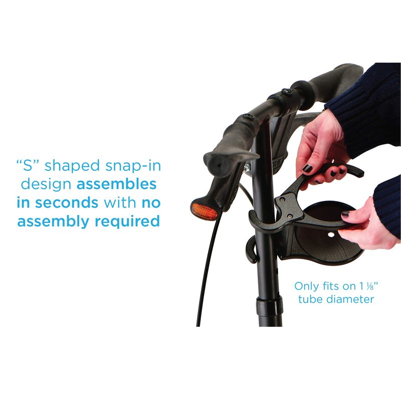 - NO ASSEMBLY and attaches in just seconds. The cup holder simply attaches to the tube with the “S” shaped snap-in design.