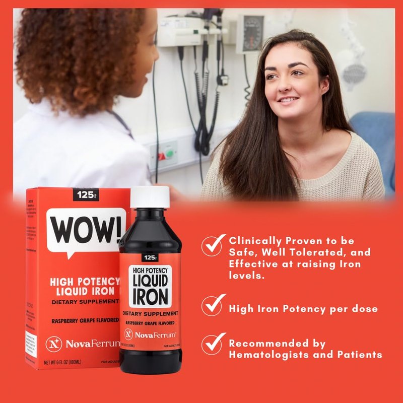NovaFerrum Wow | 125 High Potency Liquid Iron Supplement | Liquid Iron for Adults | Iron Deficiency | 125mg of Iron Per 5mL Dose | Vegan Verified | Gluten Free Certified | Sugar Free