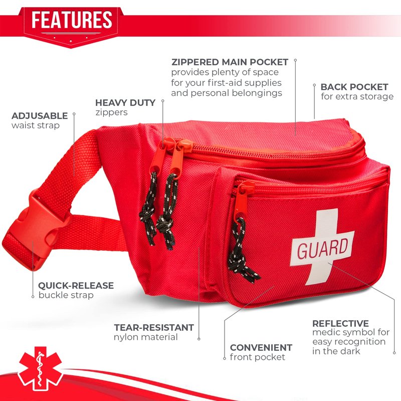 - FIRST AID WAIST PACK - Is ideal for lifeguards working at a beach or pool, or hikers looking to keep their equipment and personal belongings well organized and easily accessible.