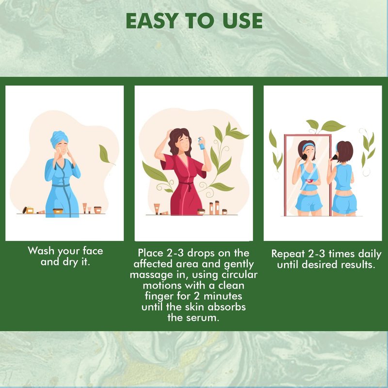 Place three drops on the affected area and gently massage in with a clean finger. Repeat 2-3 times daily until desired results. It can take up to three weeks to start seeing improvements.