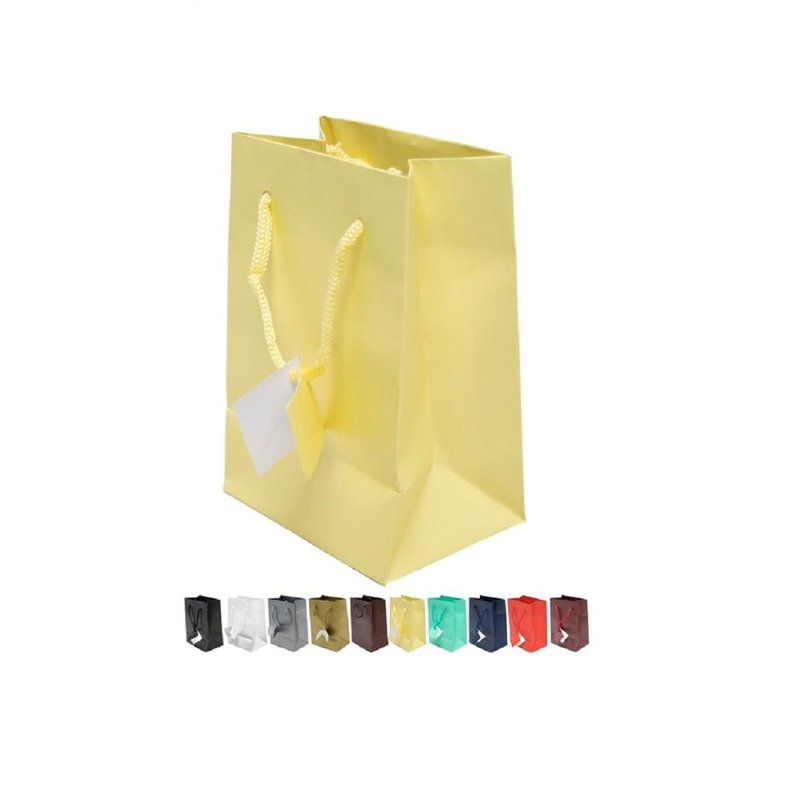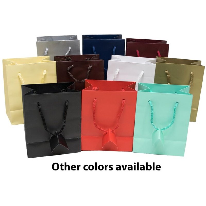 The ultimate classy bag for boutique gifts and small luxuries. A smooth matte finish on these heavyweight paper euro totes creates a sophisticated look. These 150gms laminated paper euro tote shopping bags are made with high quality paper and feature matching rope handles, wide sides and a sturdy cardboard bottom gusset. They are available in four sizes - 4.75" X 3.25" X 6.75", 6.5" X 3.5" X 6.5", 8" X 4" X 10" and 9.25" X 3.75" X 7.25" and come in 8 colors - Black, Brown, Burgundy, Ivory, Red, Aqua, Gold and Silver. Shipped flat and in bundles of 10, they easily pop up when opened and feature rope handles that make them easy to carry around. These stunning bags hot stamp beautifully to provide a highly visible and chic way to advertise your business.