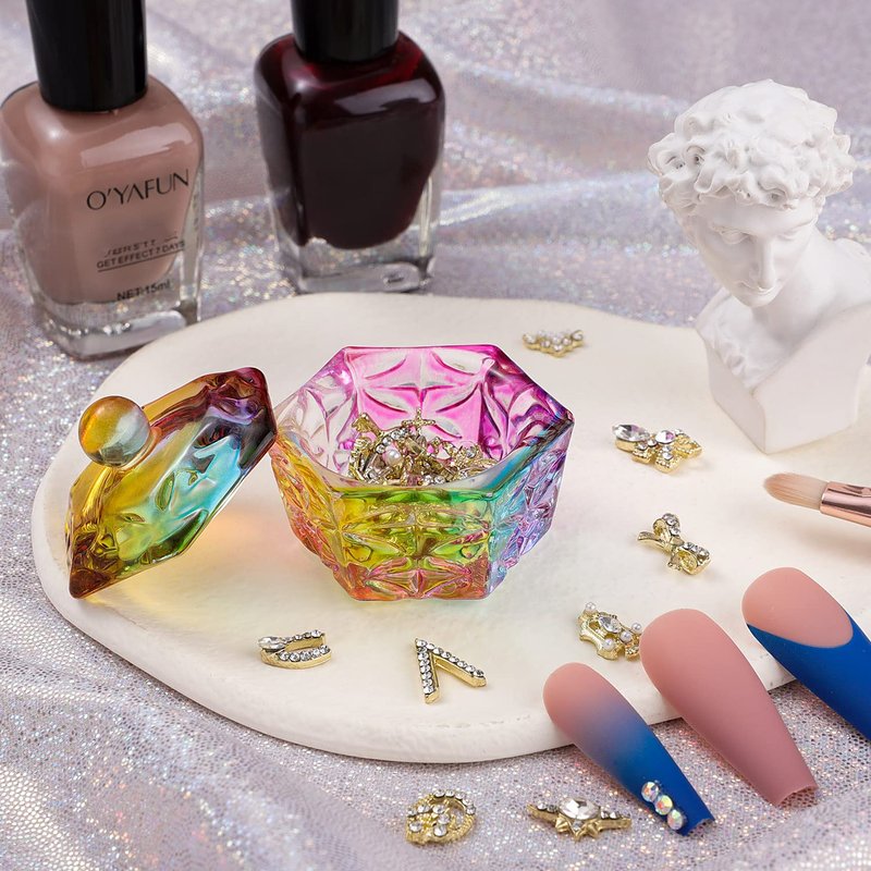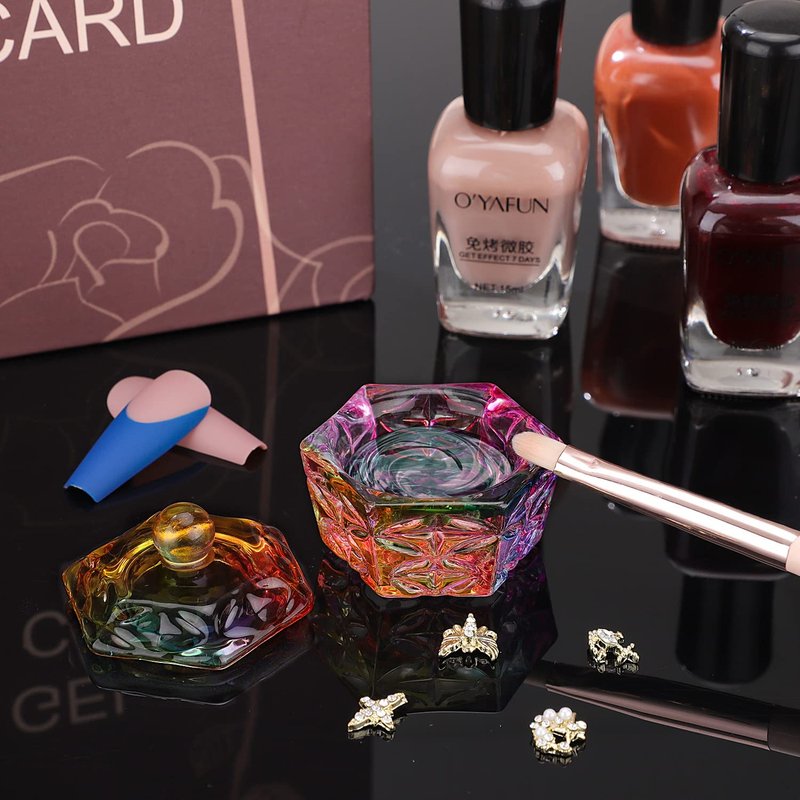 Noverlife Mini Colorized Glaze Nail Art Acrylic Liquid Powder Dappen Dish, Hexagon Shape Crystal Nail Dappen Dish with Cap Lid, Crystal Acrylic Liquid Powder Mini Glass Dish for Nail Art Manicure Care