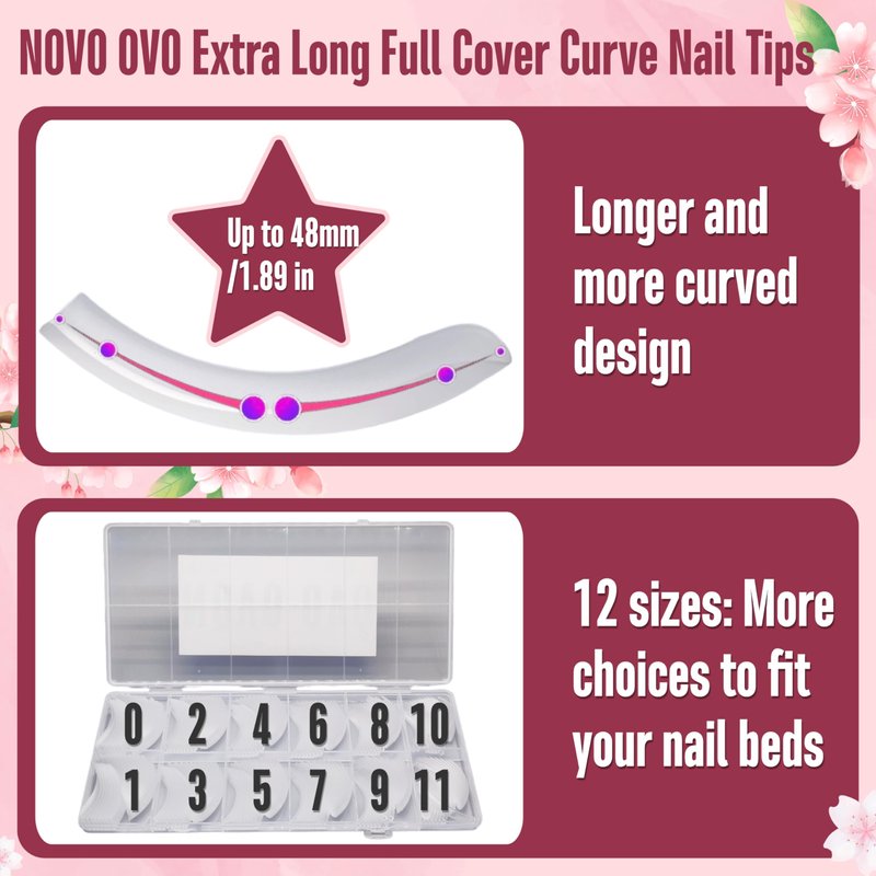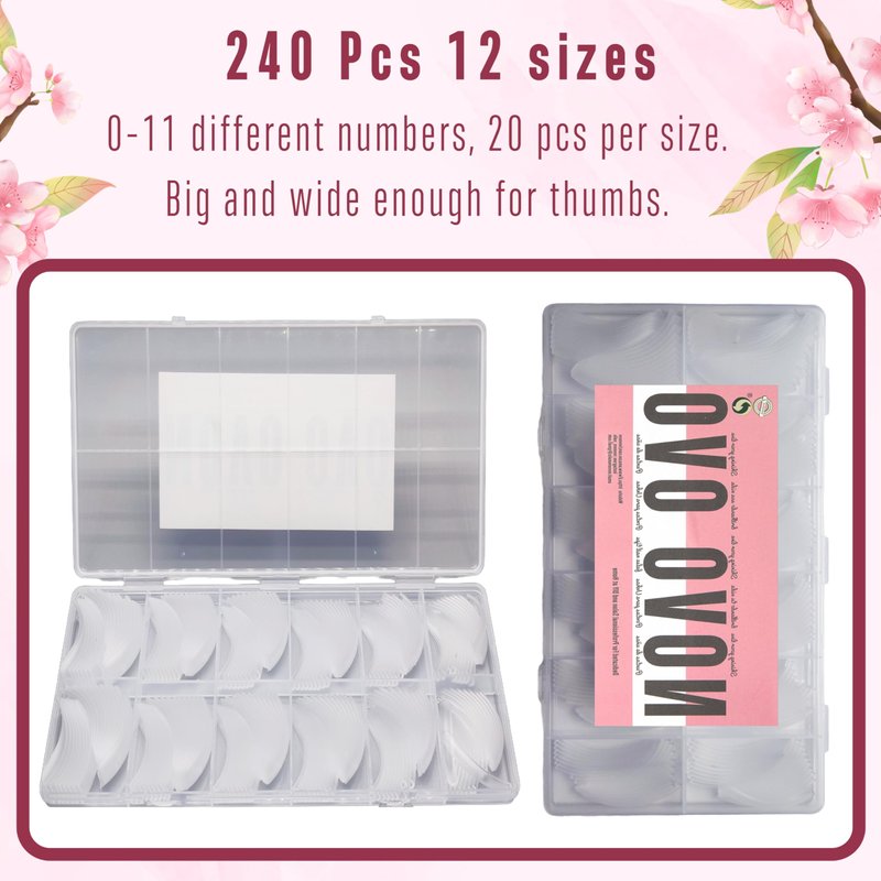 NOVO OVO QUEEN SQUARE PRO full cover nail tip is made with high quality acrylic plastic, with 12 sizes total 240 PCs. Using it you can make great natural looking curved manicure, also you can use this for the base for your design, for example you can use it to build a curved duck nail tips together with NOVO OVO half cover duck nail tips. But if you want to make curved stiletto nail tips or use it for toe nails, we recommend you to buy our responding products.