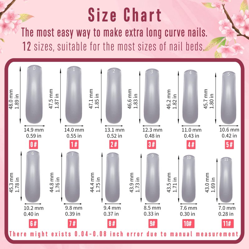 - 【Length and Shape】Despite being called XL or even XXL, our nail tips are designed with a length range from 1.89 inch to 1.69inch (from the largest tip to the smallest tip). You can easily cut and trim them to your desired length, whether it's XS, short, or medium, while still maintaining the natural curved shape. The top part is made sturdy, if you want to shape it into other styles like almond, oval, round, squoval, stiletto, or coffin, we recommend using a nail drill and cutter.