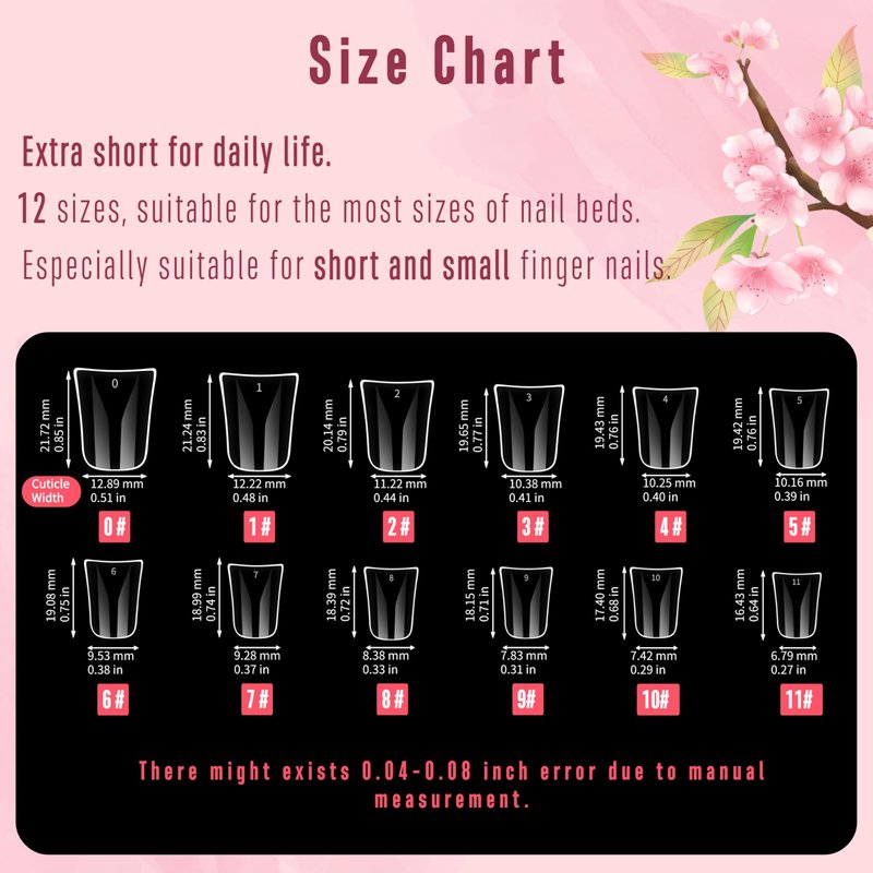 - 👍FRIENDLY TO SMALL HANDS: Our nail tips come in 12 different sizes to cater to a variety of finger sizes, especially friendly for those with petite and medium nail beds. The thumb cuticle size is 12.9mm / 0.51 inch, if you have bigger nails please choose our pre-etched duck nail tips, which has wider design. It is dedicated for both professional salons and DIY users to create stunning manicures or apply press-on nails.
