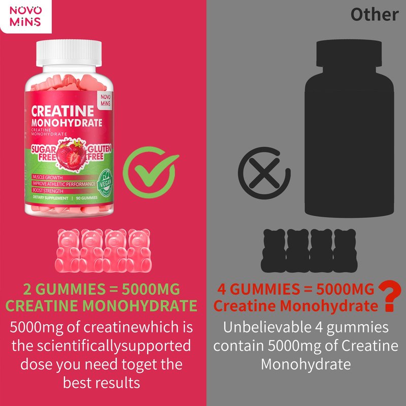 Novomins Creatine Monohydrate Gummies 5000mg for Men & Women, Chewables Creatine Monohydrate for Muscle Strength, Muscle Builder, Energy Boost, Pre-Workout Supplement(90 Count)-Strawberry Flavor
