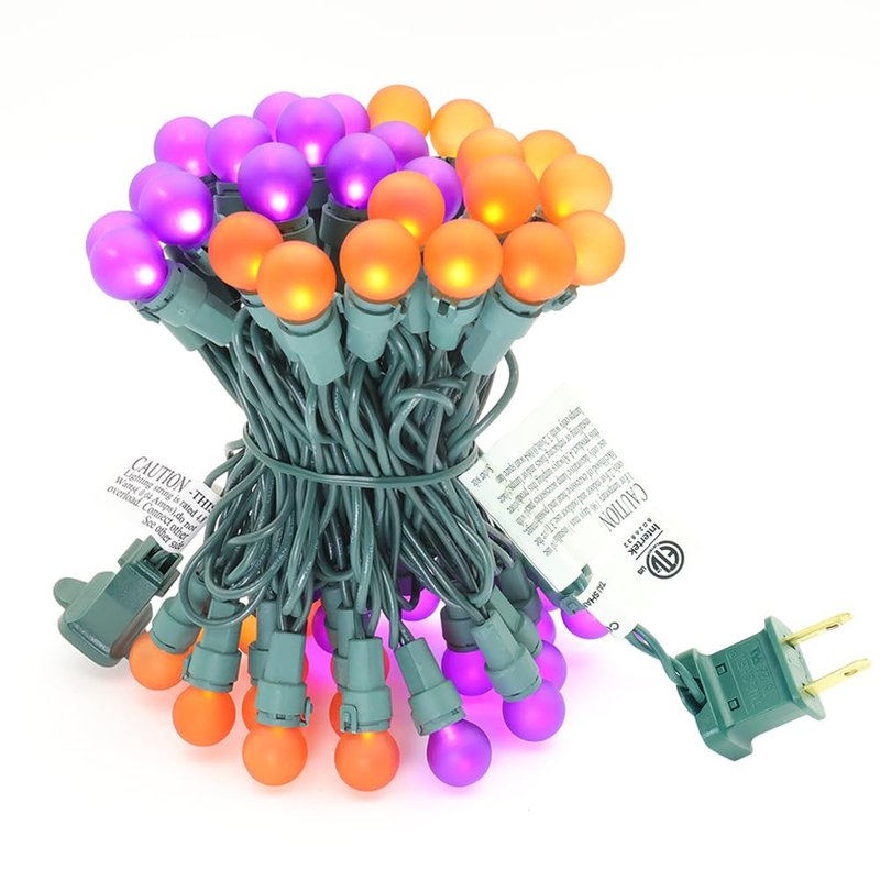 - 50 orange and purple G15 bulbs spaced on green cord, total length 13.5 ft. 4 inch spacing, 12 inch lead, 4 inch tail. A string of lights, a collection of soft orange and purple mini lights, create a stunning pattern of light. Use it to wrap branches or porches to welcome trick or treat to your home this Halloween