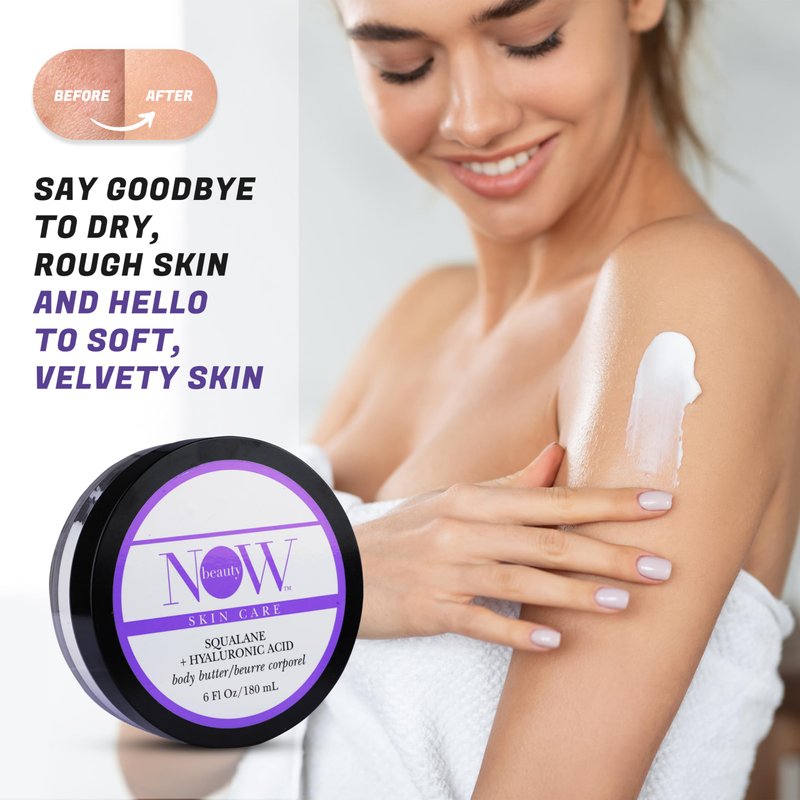 NOW Beauty Squalane Body Butter - Squalane and Hyaluronic Acid Body Lotion with Hydrating Coconut Oil and Shea Butter - Luxurious, Moisturizing, Non-Greasy Cream for Dry Skin - 6 oz