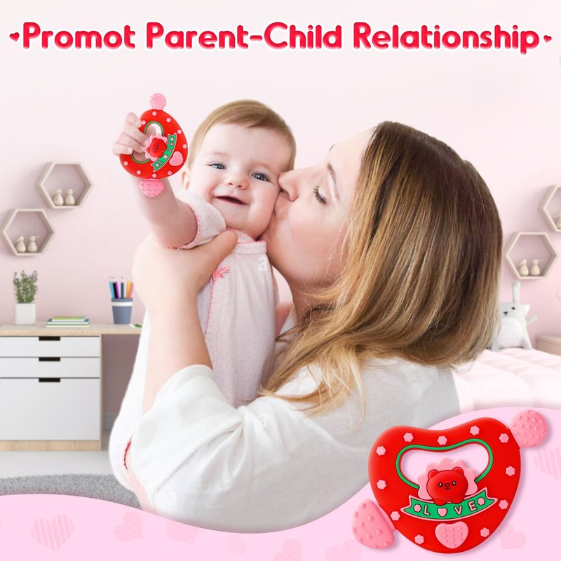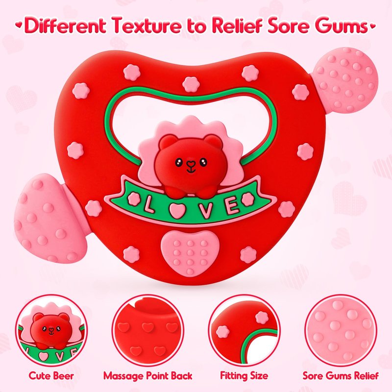 - đ» ăSymbol of Love and Comfortă: Our Valentine's Day Heart & Bear Teether is more than a teething aid; it's a symbol of love and comfort. The heart-shaped design, adorned with a delightful bear portrait, brings warmth to your baby's teething journey. Made from advanced silicone, this teether offers superior quality and is a breeze to clean, ensuring both safety and ease for parents. Make this Valentine's Day special with a thoughtful gift that cares for your baby's well-being.