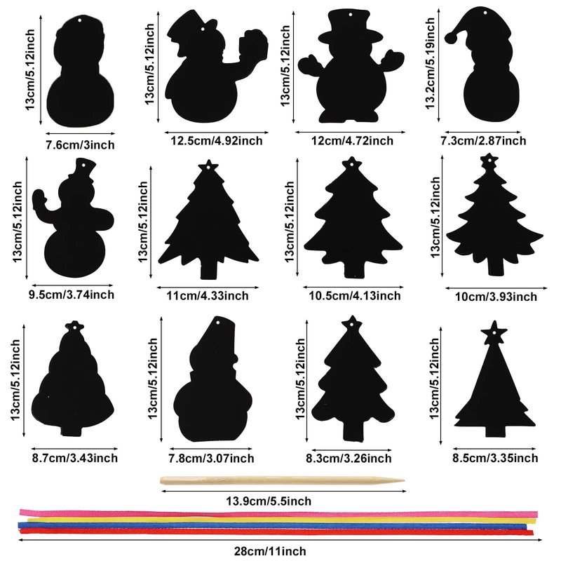 - Package Content: You will receive 96 pieces of Christmas scratch papers, 96 ribbons and 48 wooden sticks. Scratch papers have 12 shapes. The size of each scratch paper is about 13x9cm/5.12x3.54in, and the size of wooden sticks is about 14cm/5.51in, and the length of ribbons is about 28cm/11in. Sufficient quantity will be enough for your kids to play happily and have a wonderful Christmas.