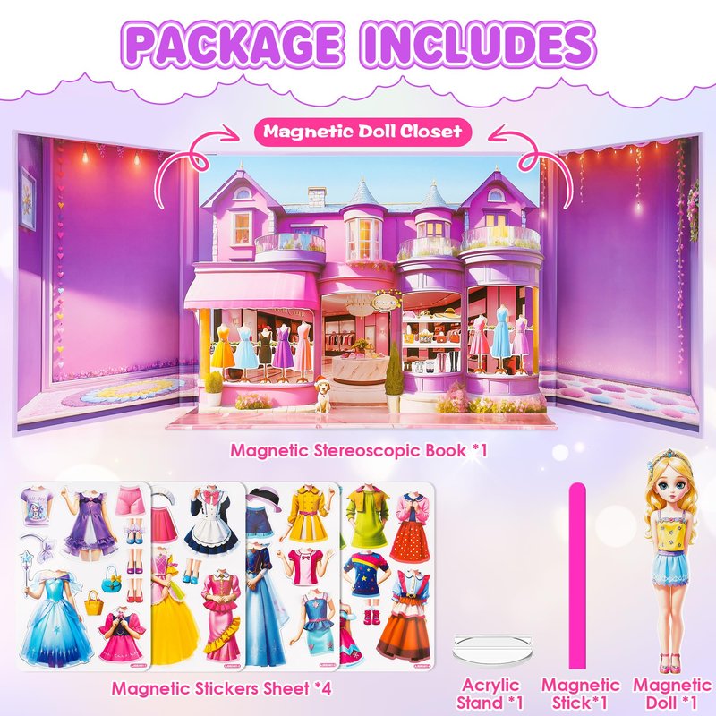 - Endless Styling Options: 4 sheets of magnetic stickers with over 20 enchanting dresses, shoes, handbags, hats, and hair accessories, children can explore their fashion creativity, dressing up the dolls in countless combinations to express their unique style