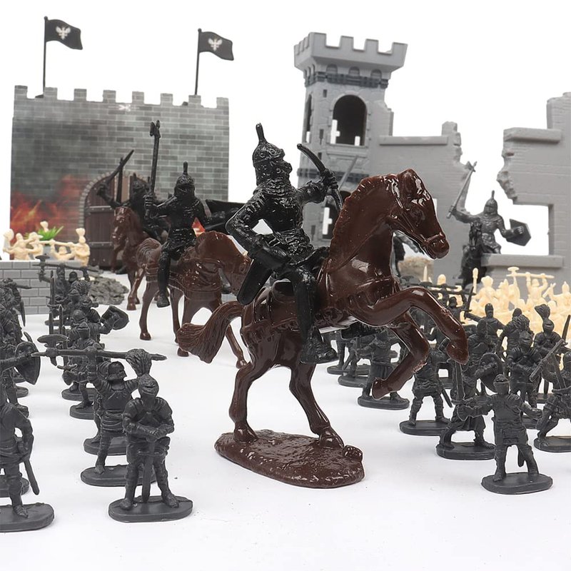 - 【Package Included】8pcs x cavalry, 200pcs x minion(grey yellow), 12pcs/2sets x arrow tower, 1pc x castle box, 1pc x ruin, 2pcs x flag, 10pcs x stone