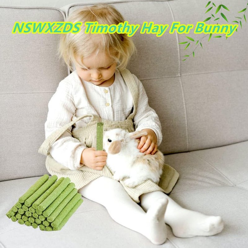 - 1.【Rabbit Toy & Bunny Food】:Timothy hay sticks for guinea pig handmade from 100% natural material, healthy & harmless timothy hay grass for rabbit.Hamster timothy toy contains high fiber, low protein, multiple vitamins. Timothy hay for rabbit not just a molar clean teeth bunny treat snack,bunny hay also can be used as a hamster chew toy. Rabbit chew treats are very beneficial to small animals. (Included 48PCS)