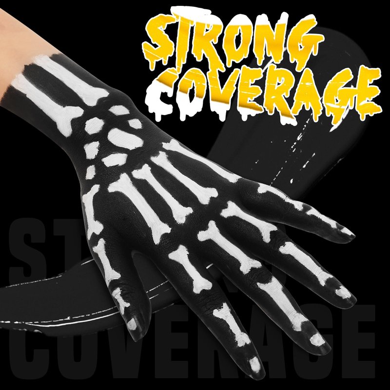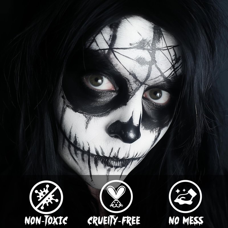 - Black+White Face Paint: The classic black+white face & body paint kit allows you to paint a variety of black and white makeup effects. Set includes white and black creams, each 55g, about 1.94 oz, large capacity can be used for multiple face painting. And each color comes with a brush, suitable for large areas coloring.