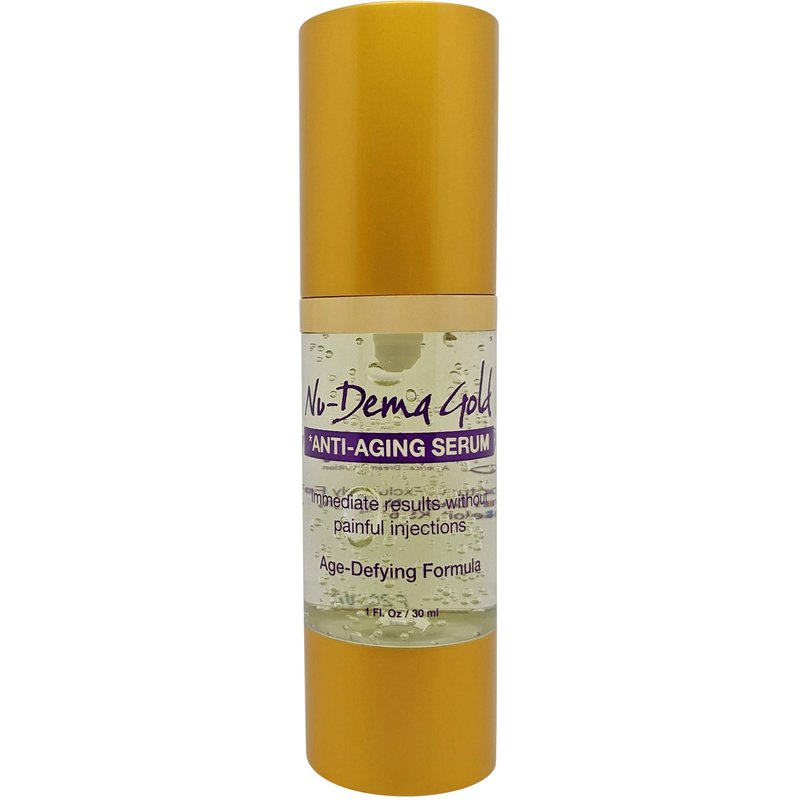Experience the difference with our NEW ENHANCED Formula, Nu-Derma GoldTM Skin Serum. This powerful serum rejuvenates your skin with proven ingredients. Hyaluronic Acid and Collagen provide instant hydration and plumpness. Vitamin C serum and Peptides improve texture and appearance. Aloe Vera soothes and nourishes. Renew, rebuild, and strengthen your skin with each application. Complete ingredient list on bottle "hang tag". Trust Nu-Derma GoldTM for radiant, youthful-looking skin!