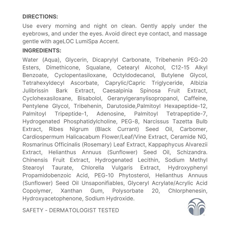 Enhance the appearance of your eye area with Nu Skin ageLOC LumiSpa IdealEyes Activating Eye Cream. Formulated to pair seamlessly with the ageLOC LumiSpa Accent, this eye cream offers targeted benefits to revitalize and refresh the delicate skin around your eyes. In just 30 seconds per eye, experience the hydrating and smoothing effects that leave your eyes looking refreshed. This cream softens and firms skin, providing an immediate boost to your appearance, and is specifically designed for sensitive eye areas. Why You'll Love It: Revitalizes and hydrates the under-eye area. Minimizes visible signs of puffiness, dark circles, and tired-looking skin. Smooths and softens skin for a radiant look. Provides a lifting effect around the eye. Formulated fragrance-free and suitable for all skin types. Complements the ageLOC LumiSpa Accent, enhancing its effects. Ophthalmologist-tested for safety. With a unique blend of ingredients including Peptide Complex for a firm, toned look, stabilized Vitamin C to support an even tone, Plankton Extract to boost radiance, and Squalane to retain moisture, this cream is packed with antioxidants that help shield the skin from daily environmental stressors. For optimal results, apply each morning and night on cleansed skin. Massage gently into areas around the eyes, avoiding direct eye contact, and enjoy the refreshed, vibrant look of revitalized eyes.