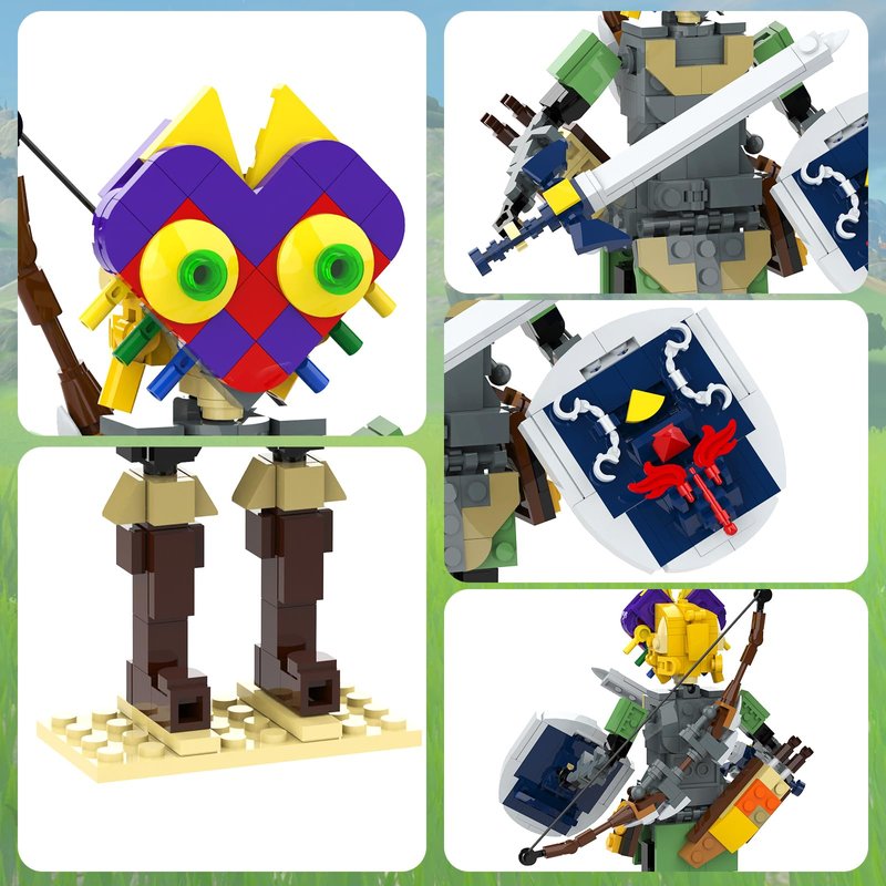 - CREATIVE APPEARANCE: It uses building bricks to recreate his look: Link wearing green clothes, holding the Master's Sword and the Hylian Shield, with a Majora's Mask, and a bow on his back.