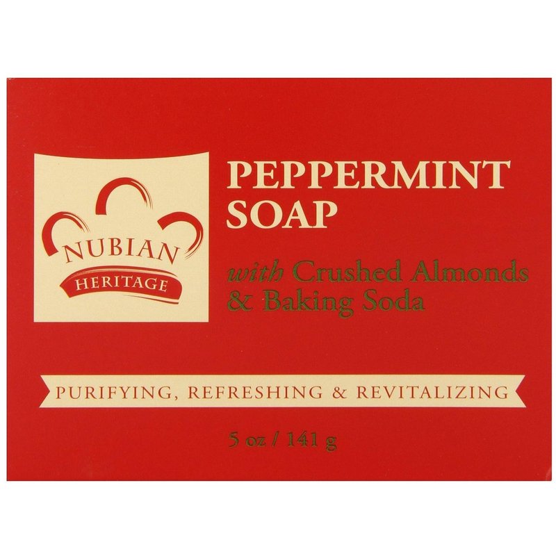 Nubian Heritage Bar Soap, Peppermint & Aloe 5 oz (Pack of 3) - Nubian Heritage Peppermint and Aloe Bar Soap from Nubian Heritage plays cool with an invigorating clean. Crushed almonds gently exfoliate while natural baking soda revitalizes the skin's appearance and fresh peppermint oil stimulates your senses in our delightful peppermint bar soap. All skin types - from dry to oily to the combination - can benefit from the purifying clean of a mentha bar soap. Based on our certified organic shea butter to protect your skin's natural moisture barrier, this peppermint hand soap is perfect for freshening the guest bath, gifting to friends who love raw bar soap, or switching up the aromatherapy of your own skincare routine. You'll love how Nubian Heritage combines the purifying power of baking soda soap, aloe for its soothing properties, and the lasting moisture of shea butter for a unique peppermint bar soap experience. Usage Instructions: Apply to washcloth or hands, create a rich lather and cleanse. Rinse well. Follow with your favorite Nubian Heritage body lotion or infused butter. Avoid contact with eyes. Details: Nubian Heritage is dedicated to maintaining the accuracy of the ingredient lists on this website. However, because raw ingredients listings are subject to change due to INCI, we cannot guarantee that these lists are complete, up-to-date, and error-free. For an accurate listing of ingredients in each product, please refer to your product packaging.