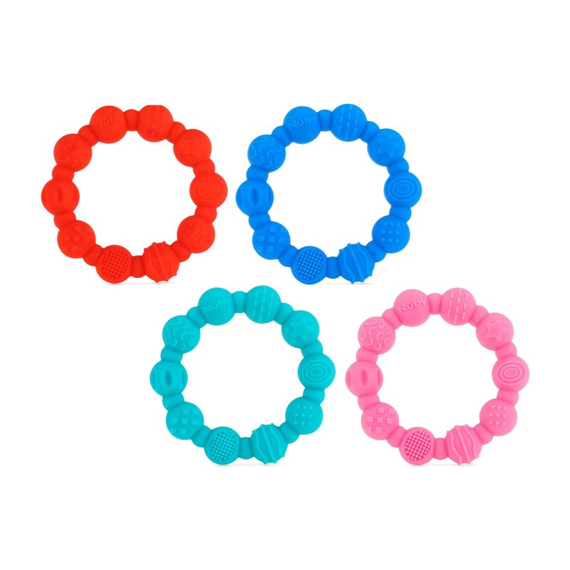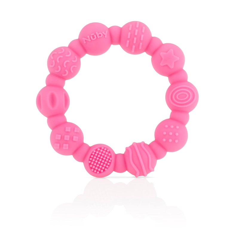 - 100% super soft silicone teether ring with multiple teething surfaces to aid in the eruption of new teeth and help to relieve the discomfort of sore and tender gums. Fun, bright colors captivate your baby.
