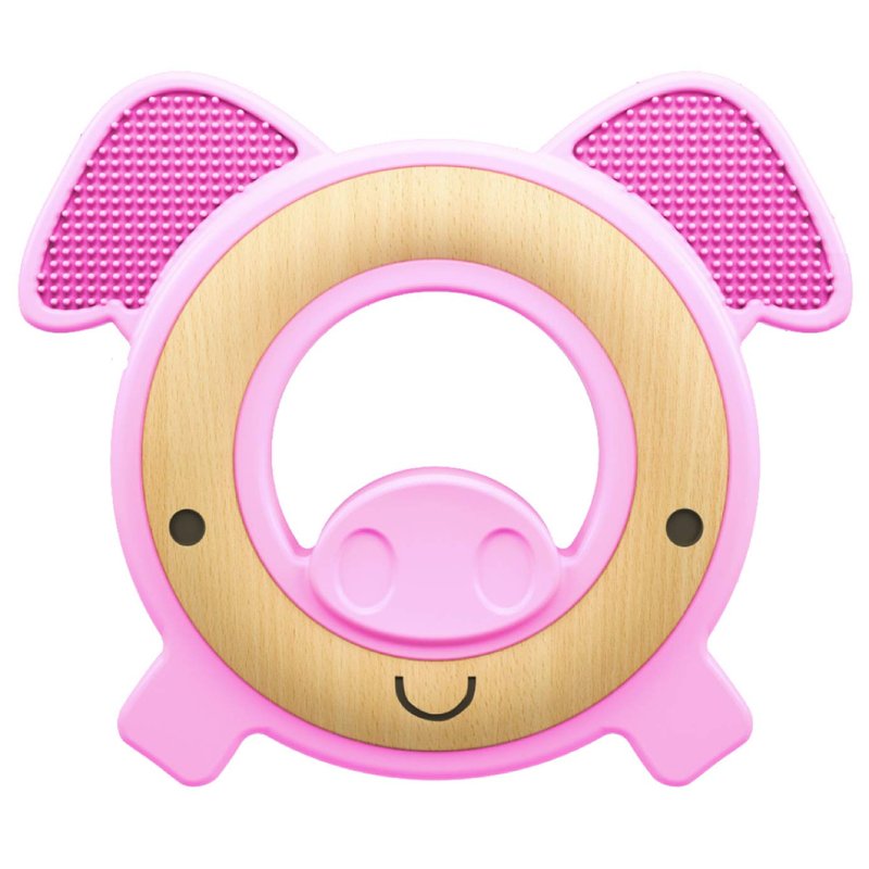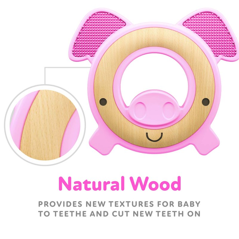 Nuby Natural Wood & Silicone Teether: Pig, 3M+, Pink