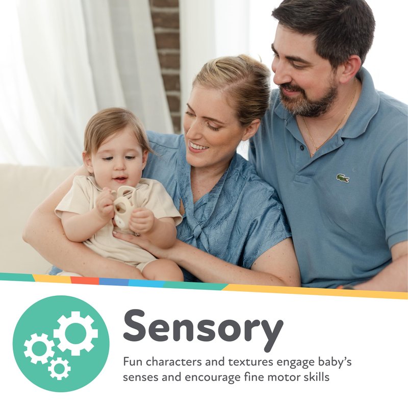 - Fun characters captivate baby’s attention while providing soothing relief. The characters feature “arms” that mimic mother’s nipple.