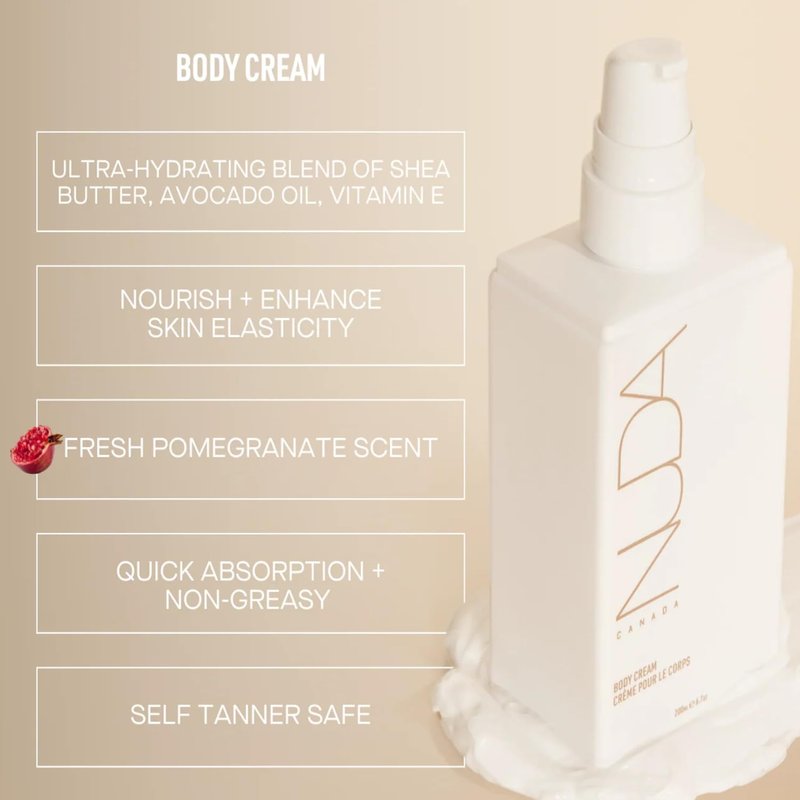 - NUDA BODY CREAM - This ultra-rich body moisturizer is infused with an invigorating pomegranate scent and powerful active ingredients like shea butter, avocado oil, and vitamin E to deeply hydrate, repair the skin barrier, and enhance skin elasticity. Enjoy soft, smooth, revitalized skin with this replenishing body cream blend.