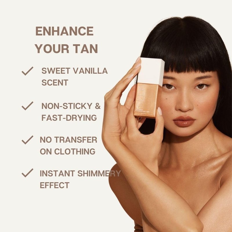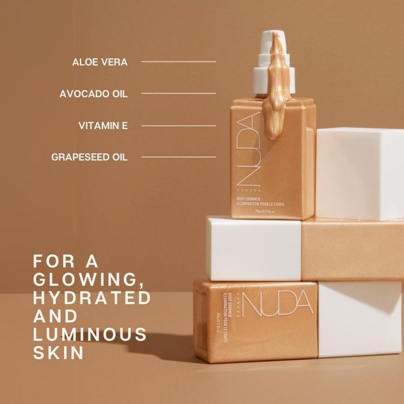- INSTANTLY ILLUMINATES SKIN - Accentuate your tan with the silky Body Shimmer by NUDA. This liquid illuminator works instantly to make your body glow, giving a golden and shimmery effect for the ultimate sun-kissed look.