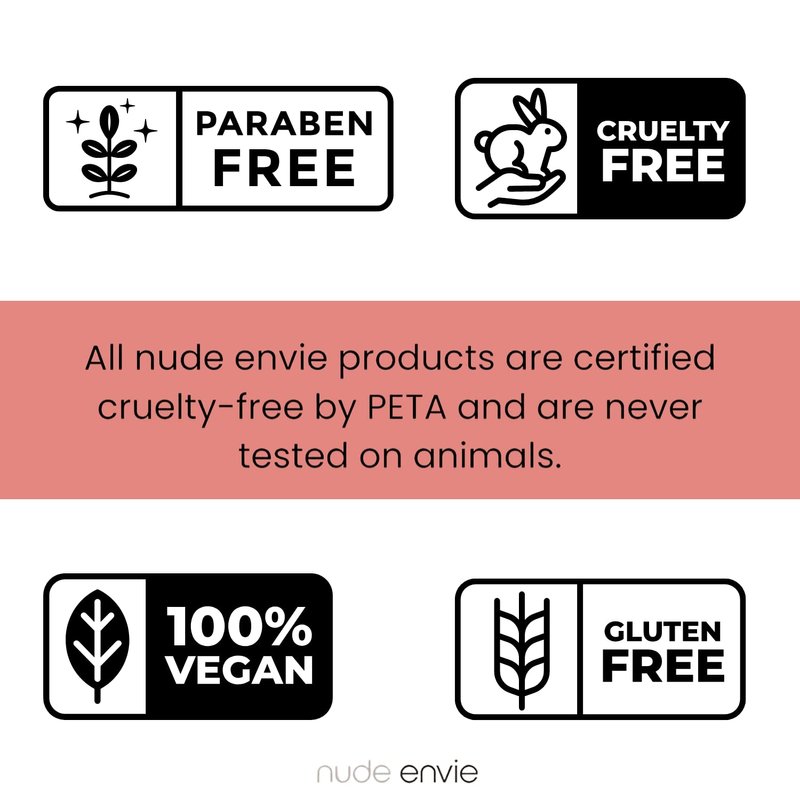 - Certified Vegan, Cruelty-Free, and Paraben Free- Nude Envie is carefully crafted using the finest ingredients. All products are certified vegan, cruelty-free, paraben-free, and gluten-free.